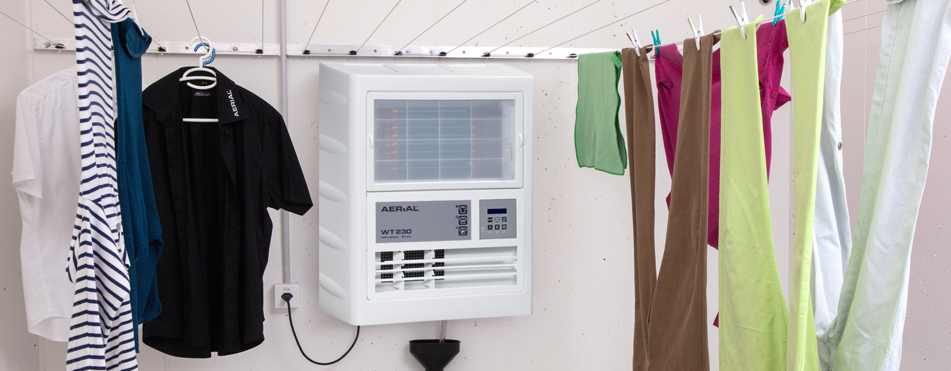 | Steuerung | Betriebsmodus (Raumtrocknung / Wäschetrocknung), Hygrometer, Hygrostat, Programmauswahl (Timer, Turbo-Trocknung), Nachtrocknungsautomatik |